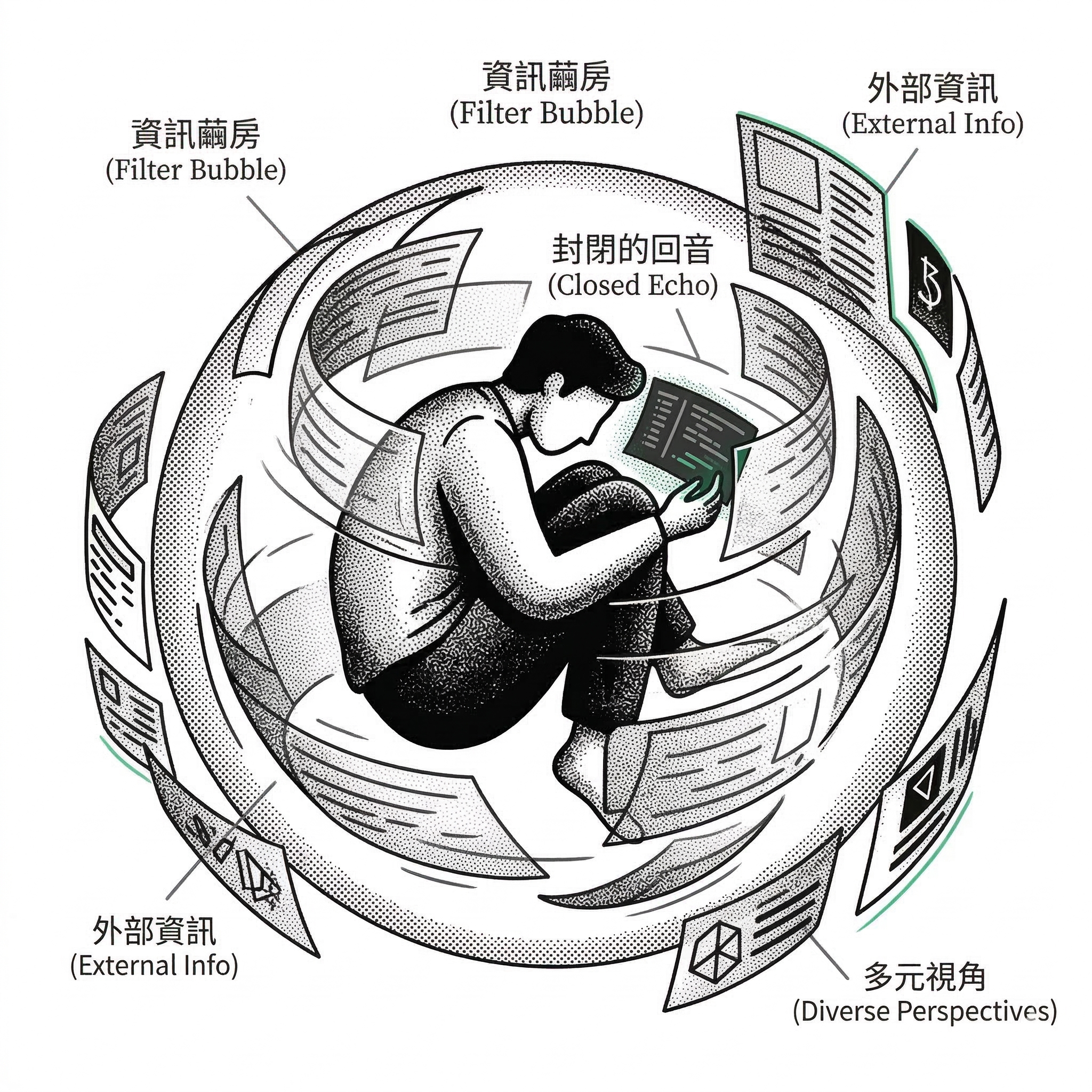 先生在訪談中描述的那種世界觀——司法被控,媒體被收,所有不利的訊息都是政治追殺——是一種典型的陰謀論結構。這種思維模式在資訊繭房裡特別容易被強化,因為繭房的機制本來就是在提供「解釋一切的答案」。